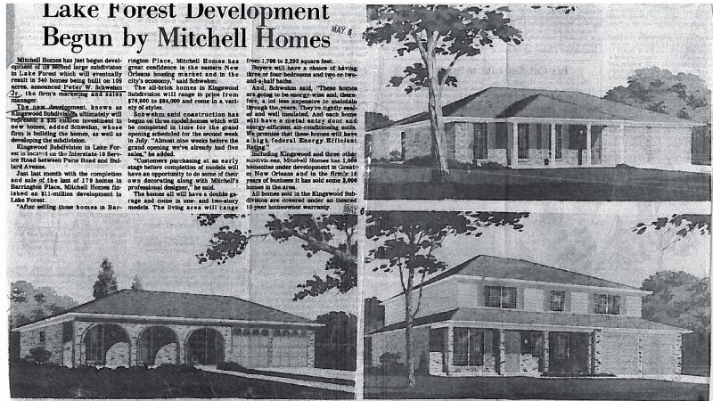 Mitchell Homes developed its second large subdivision in Lake Forest, which eventually resulted in 340 homes built on 105 acres. That subdivision was Kingswood Subdivision.